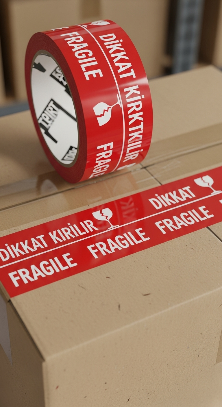 Değerli ve hassas gönderileriniz için en net ve en etkili uyarı. Bu özel baskılı koli bandı, tüm dillerde anlaşılan evrensel bir mesaj verir. Parlak kırmızı zemin üzerine büyük, beyaz harflerle yazılmış 'DİKKAT KIRILIR' ve uluslararası geçerliliği olan 'FRAGILE' metinleri anında dikkat çeker.