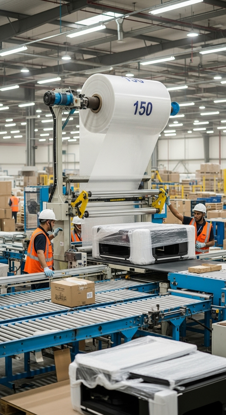 Yüksek hacimli üretim ve paketleme hatları için özel olarak tasarlanmış olan bu devasa Endüstriyel Balonlu Naylon Rulosu, operasyonel verimliliği ve kesintisiz üretimi hedefleyen işletmelerin vazgeçilmezidir. 150 cm'lik ekstra geniş eni, büyük endüstriyel parçaların, mobilya panellerinin veya otomotiv aksamlarının tek parça halinde, hızlı ve verimli bir şekilde sarılmasına olanak tanır.