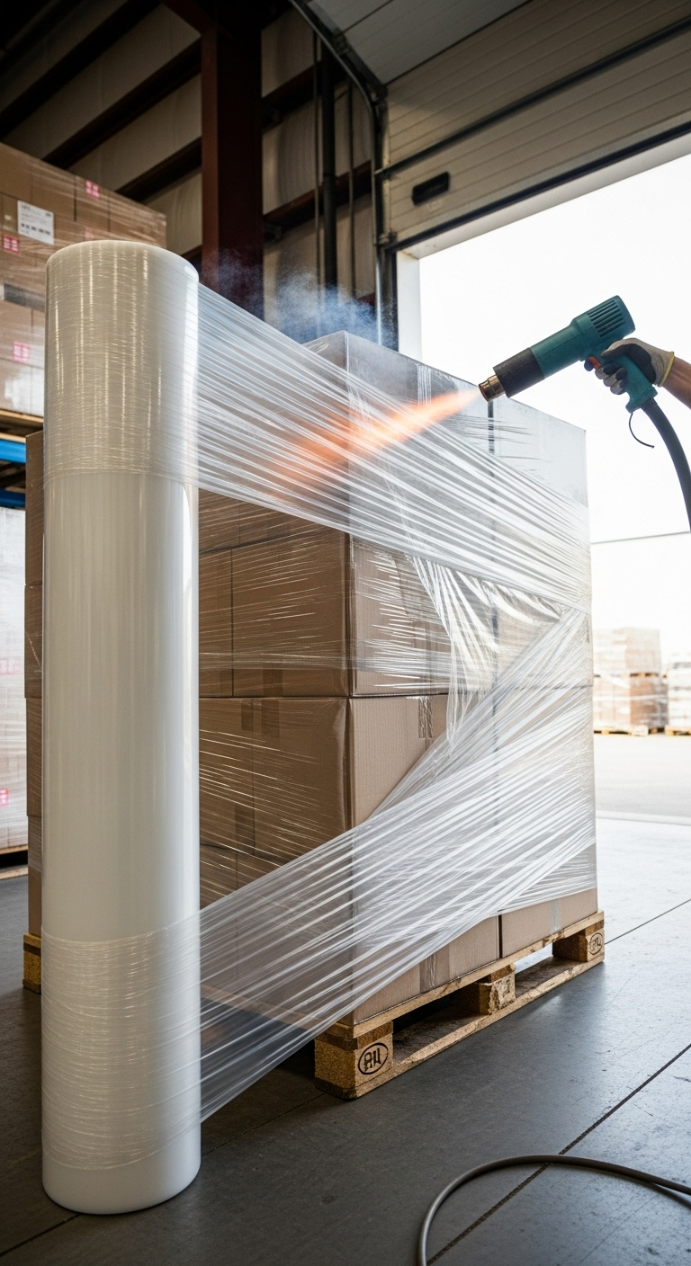 Paletlenmiş yükleriniz için en üst düzey koruma. Bu kalın, endüstriyel PE Shrink Naylon, paletlerinizi adeta bir kozaya dönüştürerek dış etkenlere karşı korur. Genellikle bir paletin üzerine bir çuval gibi geçirilir veya sarılır, ardından büyük bir endüstriyel ısı tabancası ile ısıtılır. Isı, naylonun paletin ve üzerindeki yükün şeklini alarak sıkıca daralmasını ve sabitlenmesini sağlar.